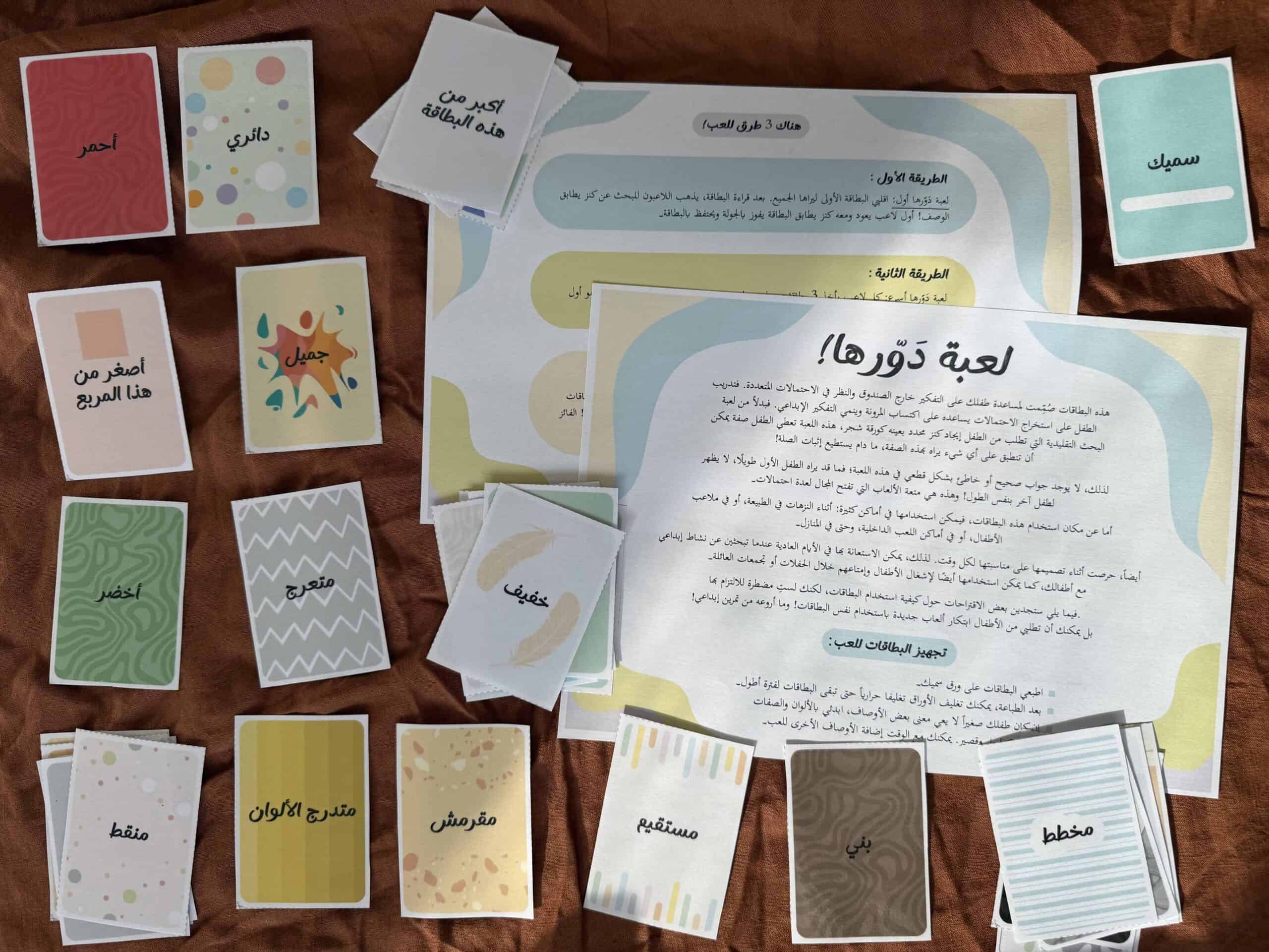 دَوِّرها! هي لعبة تعليمية تفاعلية تعتمد على بطاقات تحمل أوصافاً وصفات مختلفة، وتدعو الطفل للبحث عن أي شيء في محيطه يمكن أن تنطبق عليه هذه الصفة، ما دام يستطيع تبرير اختياره.